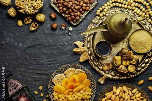 Ramadan Concept Varieties Of Dried Fruits Nuts Arabian Coffee